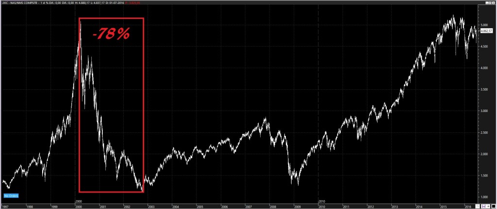 El clímax de la burbuja se dio el 10 de marzo de 2000, cuando el mercado de empresas tecnológicas NASDAQ llegó al punto máximo de 5132.52 puntos. El nivel de especulación era tan alto, que el valor de las empresas subía simplemente por tener una "e-" (electrónica) como prefijo o ".com" como sufijo.