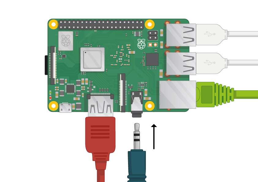 Puedes instalar tus audífonos a la Raspberry Pi para escuchar sonido o una bocina en la salida de audio de 3.5mm.