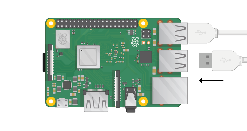 Encuentre el cable USB para su mouse y conéctalo a un puerto USB en la Raspberry Pi (no importa cuál). Lo mismo para el teclado, como se muestra en la imagen.