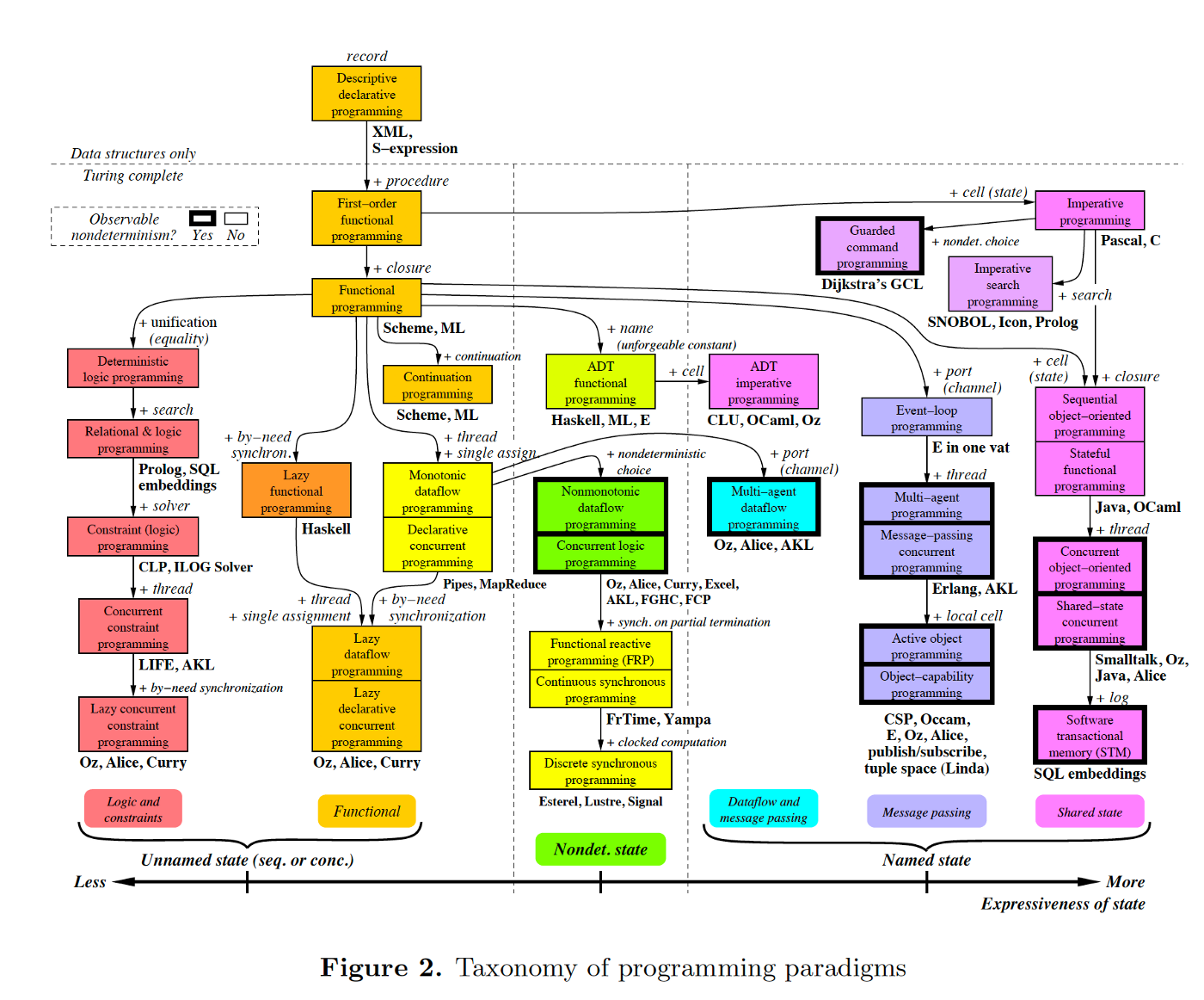 Los lenguajes declarativos pueden desglosarse en lenguajes funcionales , en los que un programa se construye mediante funciones de composición y lógica. Lenguajes de programación, en los cuales un programa se construye a través de un conjunto de conexiones lógicas. Los lenguajes imperativos se leen más como una lista de pasos para resolver un problema, como una receta. Los lenguajes imperativos incluyen C, C ++ y Java; lenguajes funcionales incluyen Haskell; Los lenguajes de programación lógica incluyen Prolog.