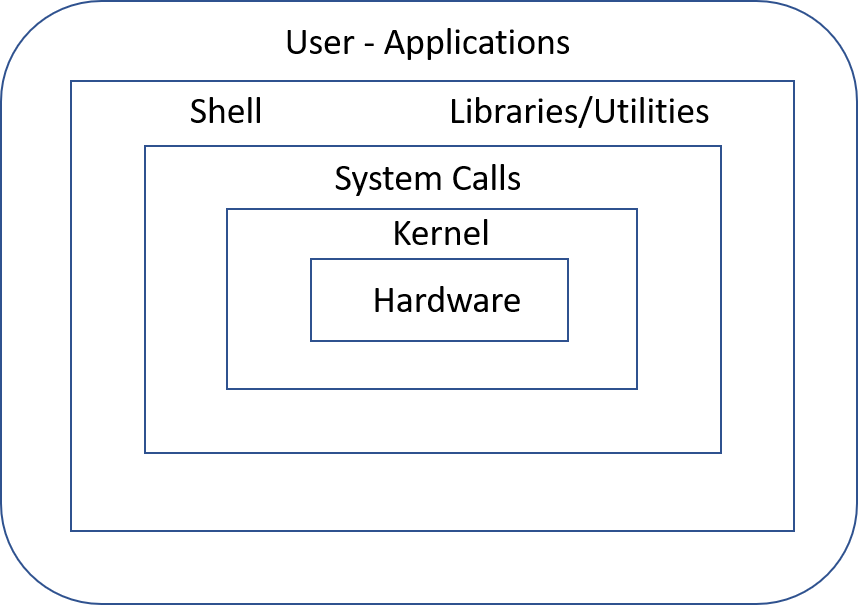 - Unix es un sistema operativo en capas entre el usuario y el hardware.