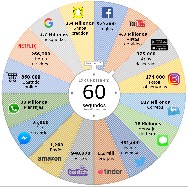 La infografía de hoy es de Internet 1.0, y muestra la actividad que se lleva a cabo en varias plataformas, como Facebook o Google, en cada intervalo de 60 segundos.